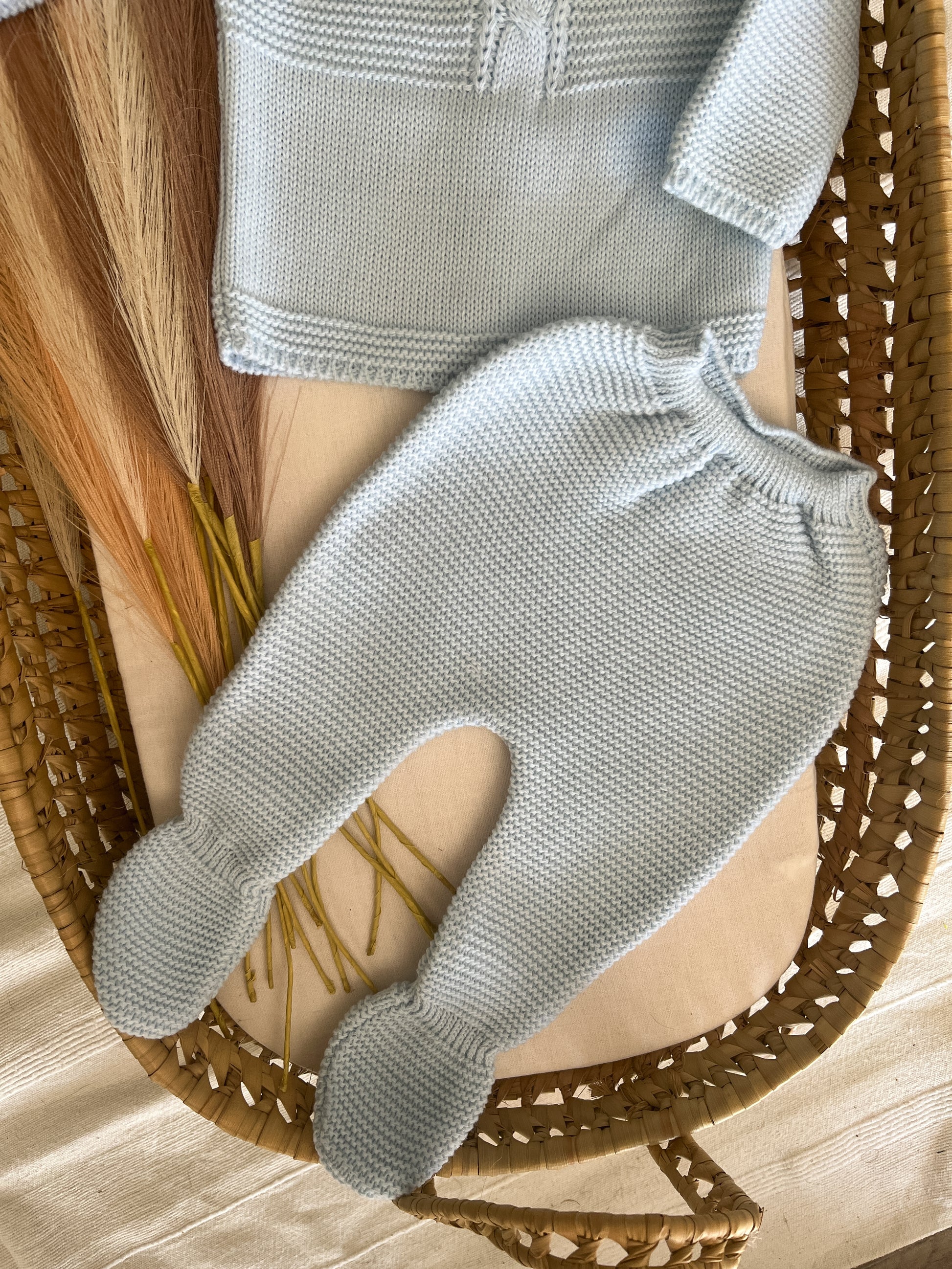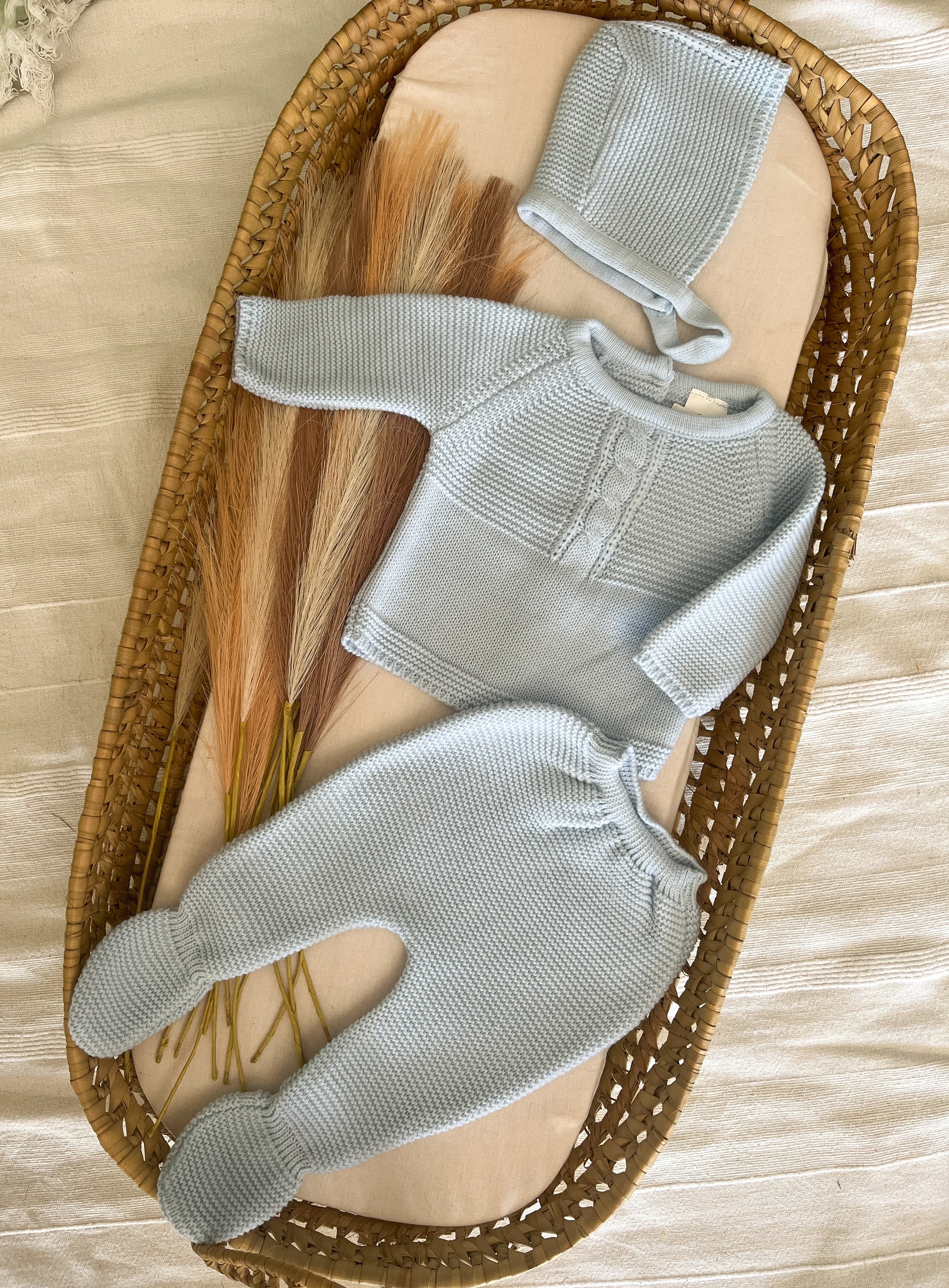Conjunto de malha para bebé composto por camisola, calças e gorro