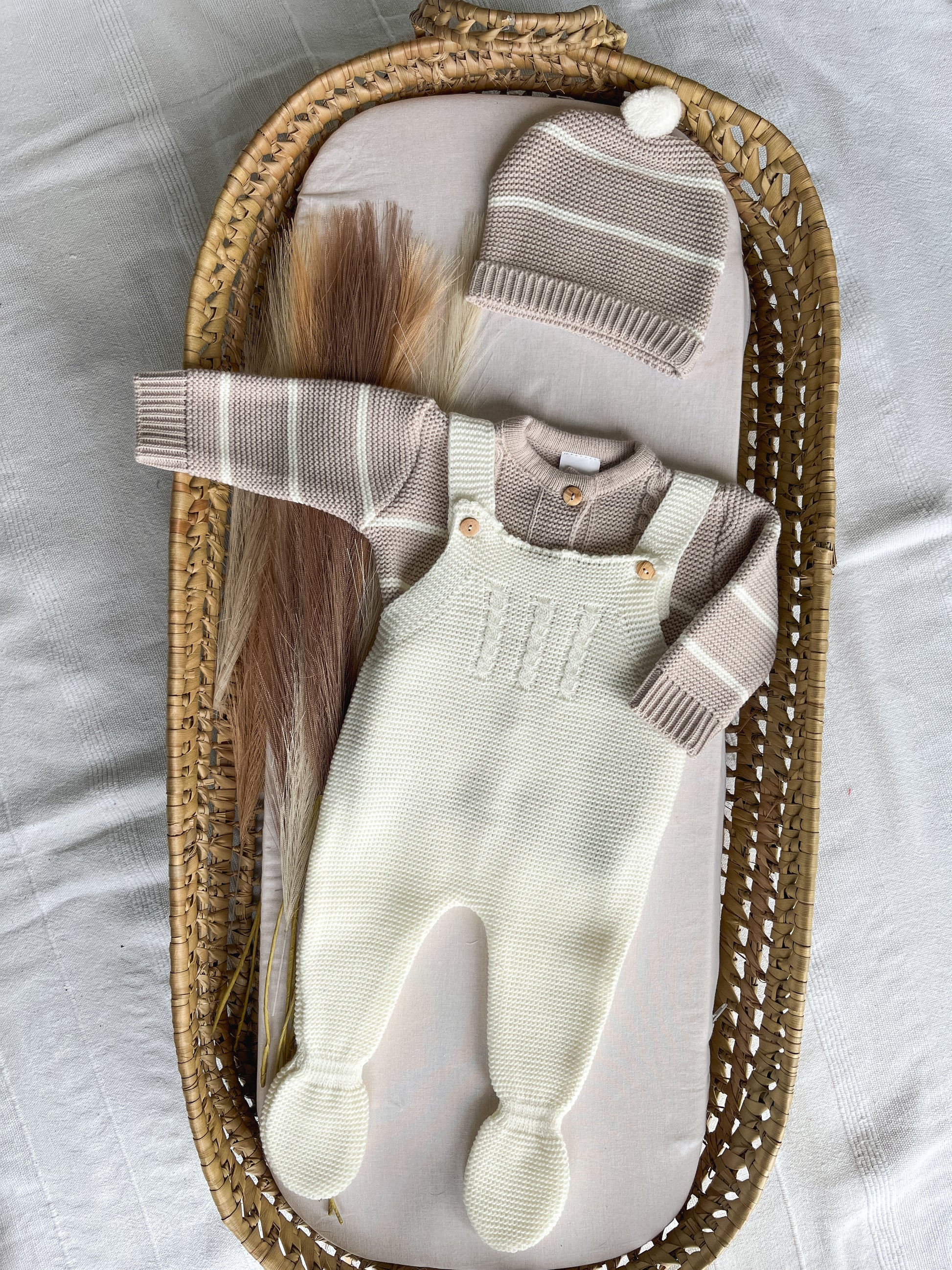 Conjunto de malha para bebé composto por casaco, jardineira e gorro