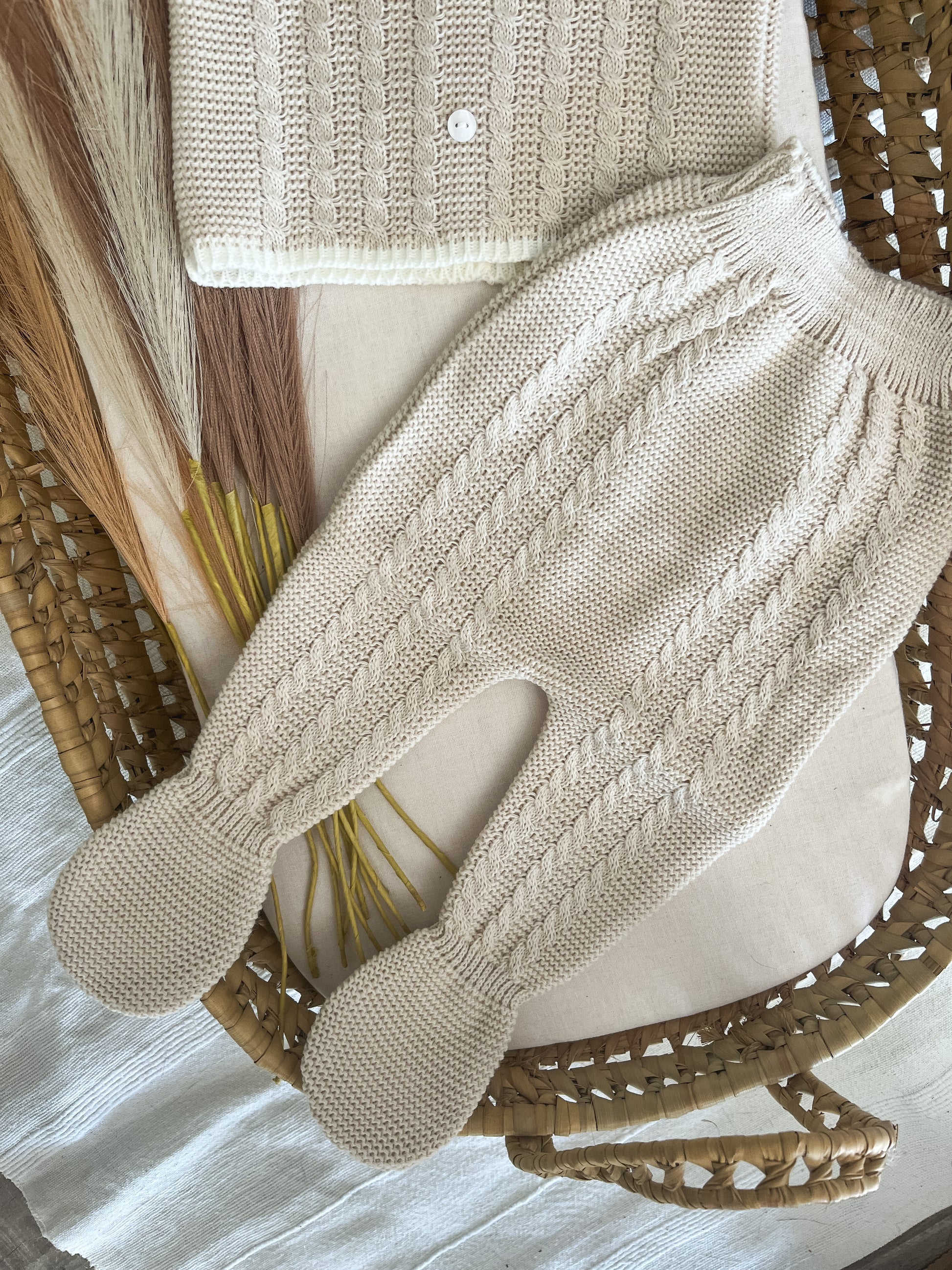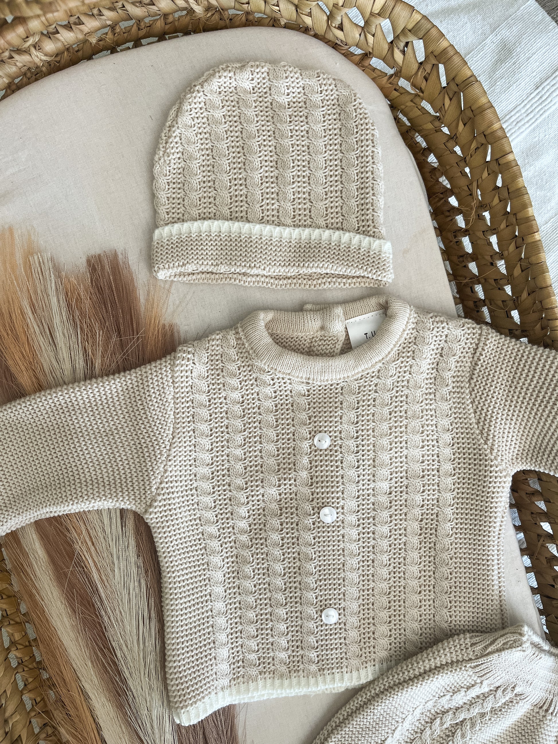 Conjunto de malha para bebé composto por camisola, calças e touca