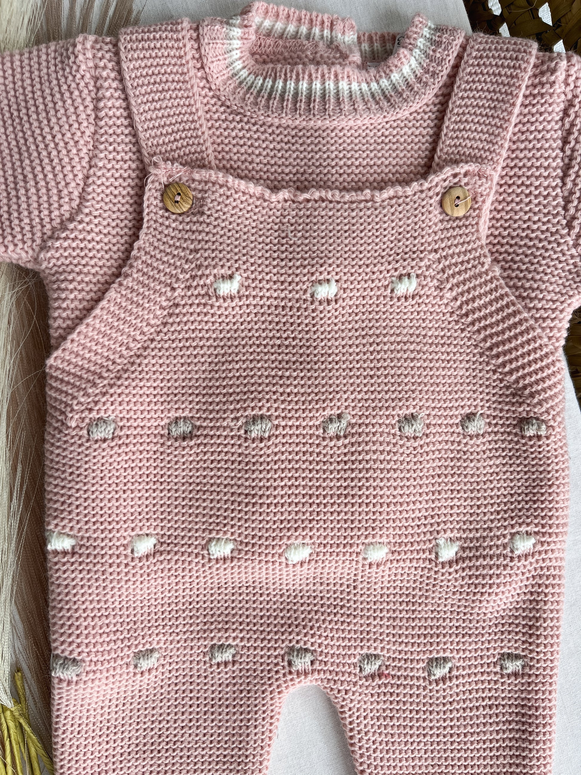 Conjunto de malha para bebé composto por camisola, jardineira e gorro