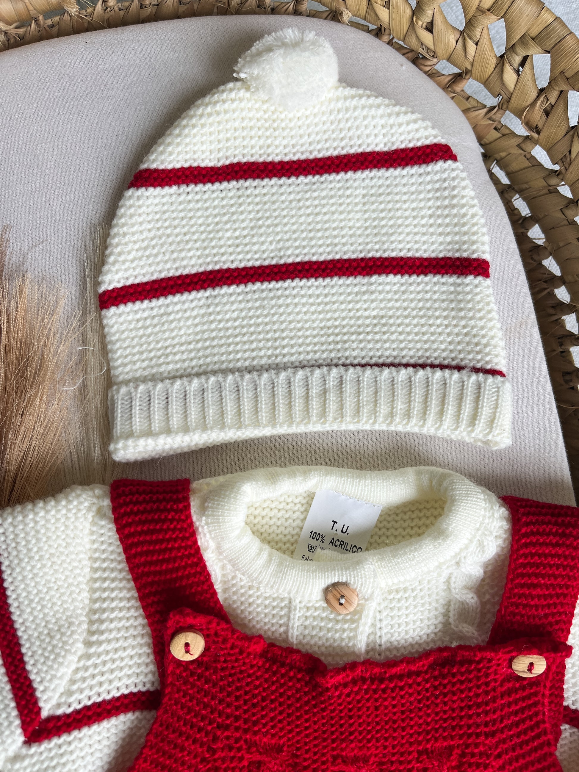 Conjunto de malha para bebé composto por casaco, jardineira e gorro