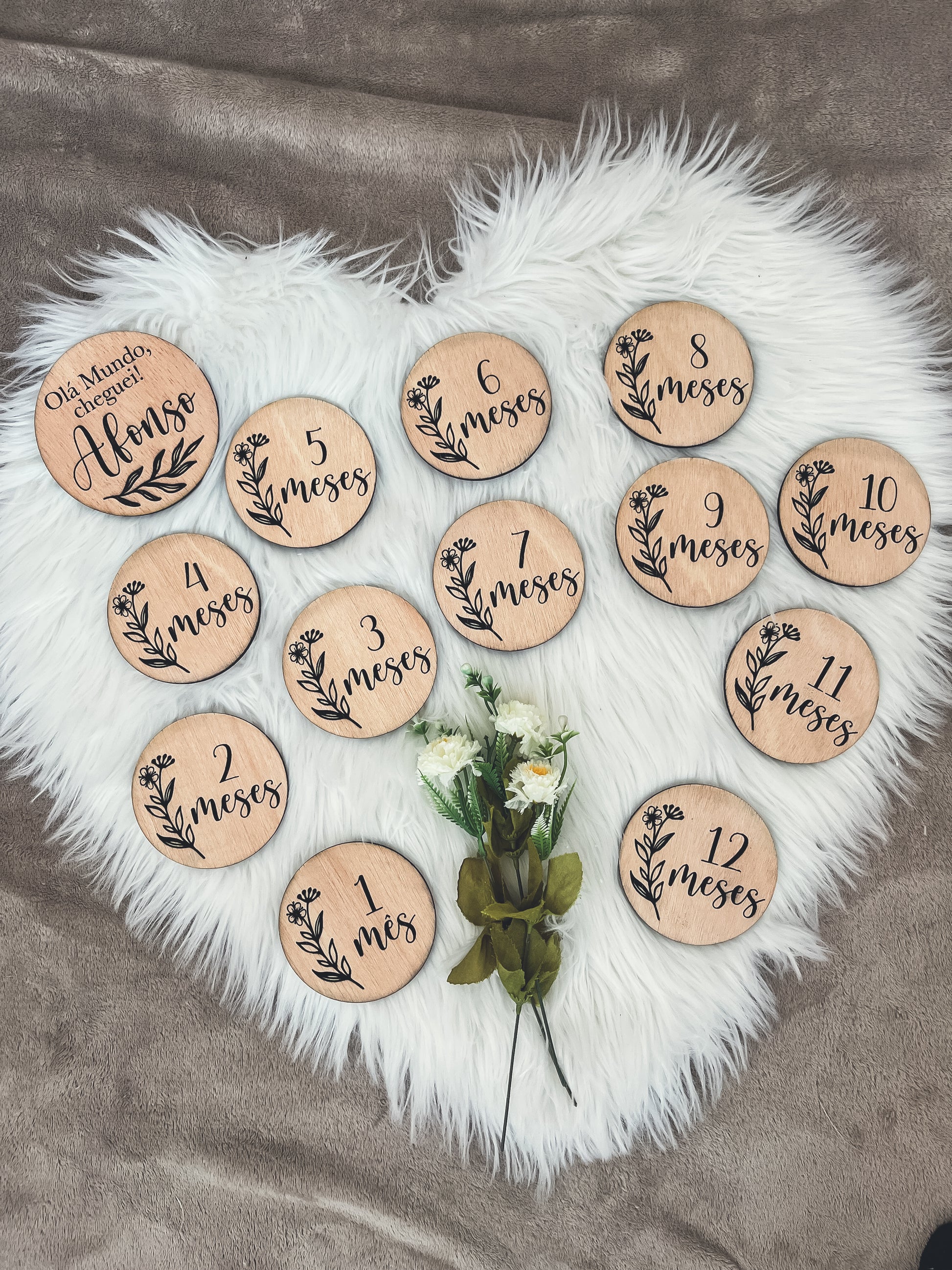 Conjunto placas bebé milestones meses + placa “olá mundo”